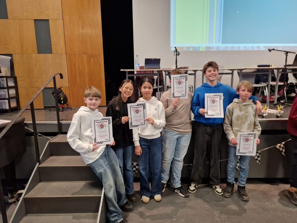 Die Cäci ist mit zwei Teams in Wettkampfklasse vier angetreten: fünf Siege aus sieben Spielen (Team 1) bzw. vier Siege und ein Unentschieden aus sieben Spielen (Team 2) haben dieses Mal leider nicht gereicht, um sich für das Weser-Ems-Finale am kommenden Donnerstag zu qualifizieren. Voller Respekt, aber mit erhobenem Haupt gratulieren wir den Siegern unserer Wettkampfklasse aus Bad Zwischenahn und Jever, welche an diesem Tag besser gespielt haben und sich für das Finale qualifizieren konnten. Unsere Cäci-Teams, bestehend aus Malte (7c), Minh (6b), Bella (6b), Claas (6b), Lewe (6b), Leo (6b), Ravi (6m), Onno (5c), Emil (5m), Noah (6c) und Gorwin (6m), belegten die Plätze drei und vier gegen insgesamt sehr stark aufspielende Teams aus der Region. Dennoch erspielten wir uns mit gutem Spiel einen Pokal für den dritten Platz, welcher voller Stolz auf seinen neuen Platz bei Petra in die Cäciteria getragen und gefeiert wurde. Ein Tag voller Erinnerungen, welche wir mit Sicherheit lange im Kopf behalten werden.